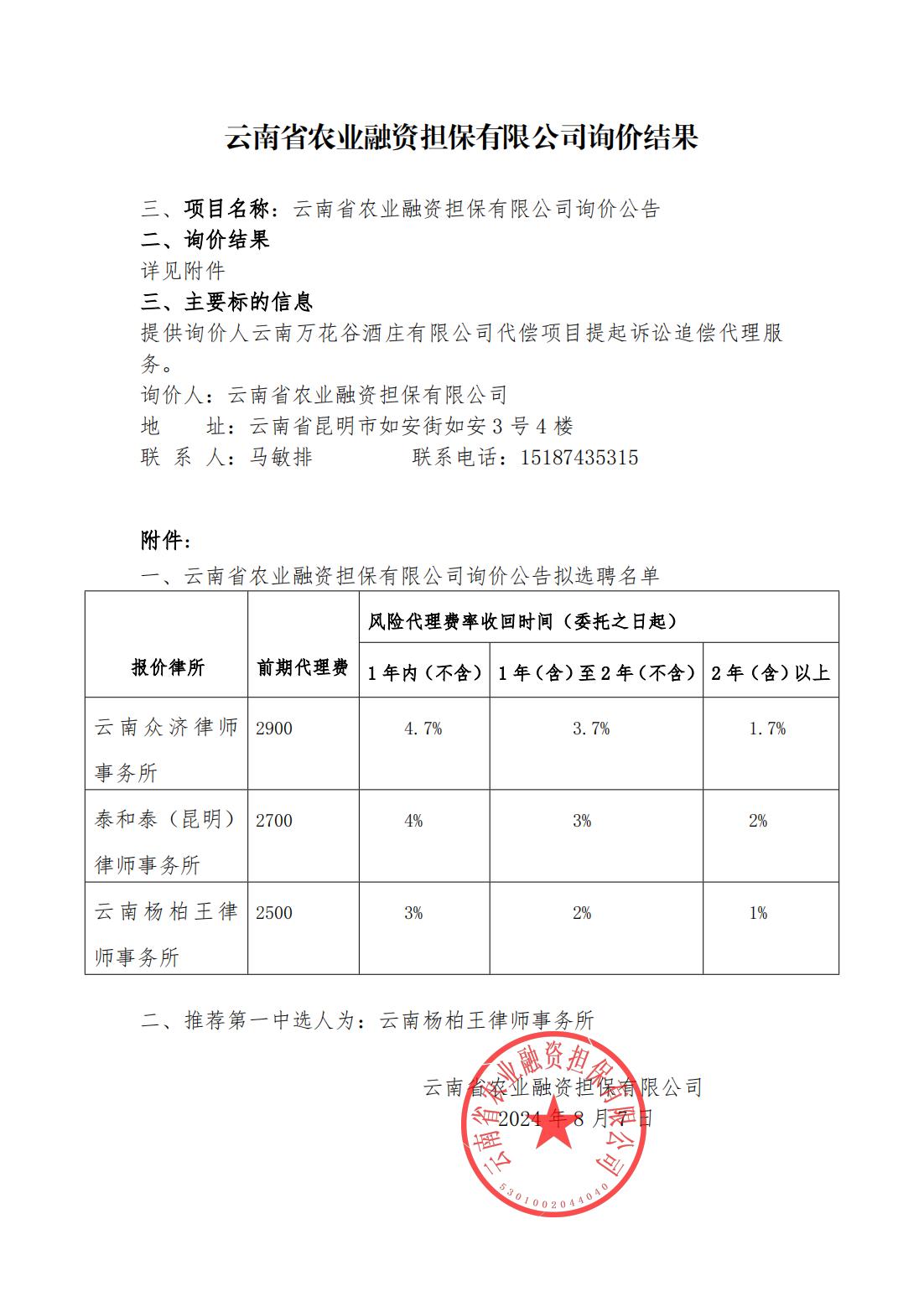 云南省農(nóng)業(yè)融資擔保有限公司詢價結(jié)果