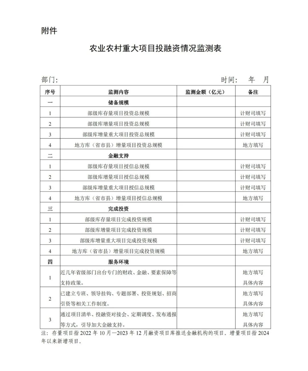 (二)加強項目監(jiān)測管理。要定期發(fā)布報告,對區(qū)域內(nèi)重大項目投融資建設(shè)進度、實施成效等進行調(diào)度、監(jiān)測。我部將會同中國人民銀行,按季對各省實施情況進行監(jiān)測。各省級農(nóng)業(yè)農(nóng)村部門運用地方性平臺開展項目儲備且數(shù)據(jù)未上傳綜合融資服務(wù)平臺的,應(yīng)于每季度初5日前報送上季度地方自有平臺投融資項目儲備情況和投融資情況監(jiān)測表(附件)。