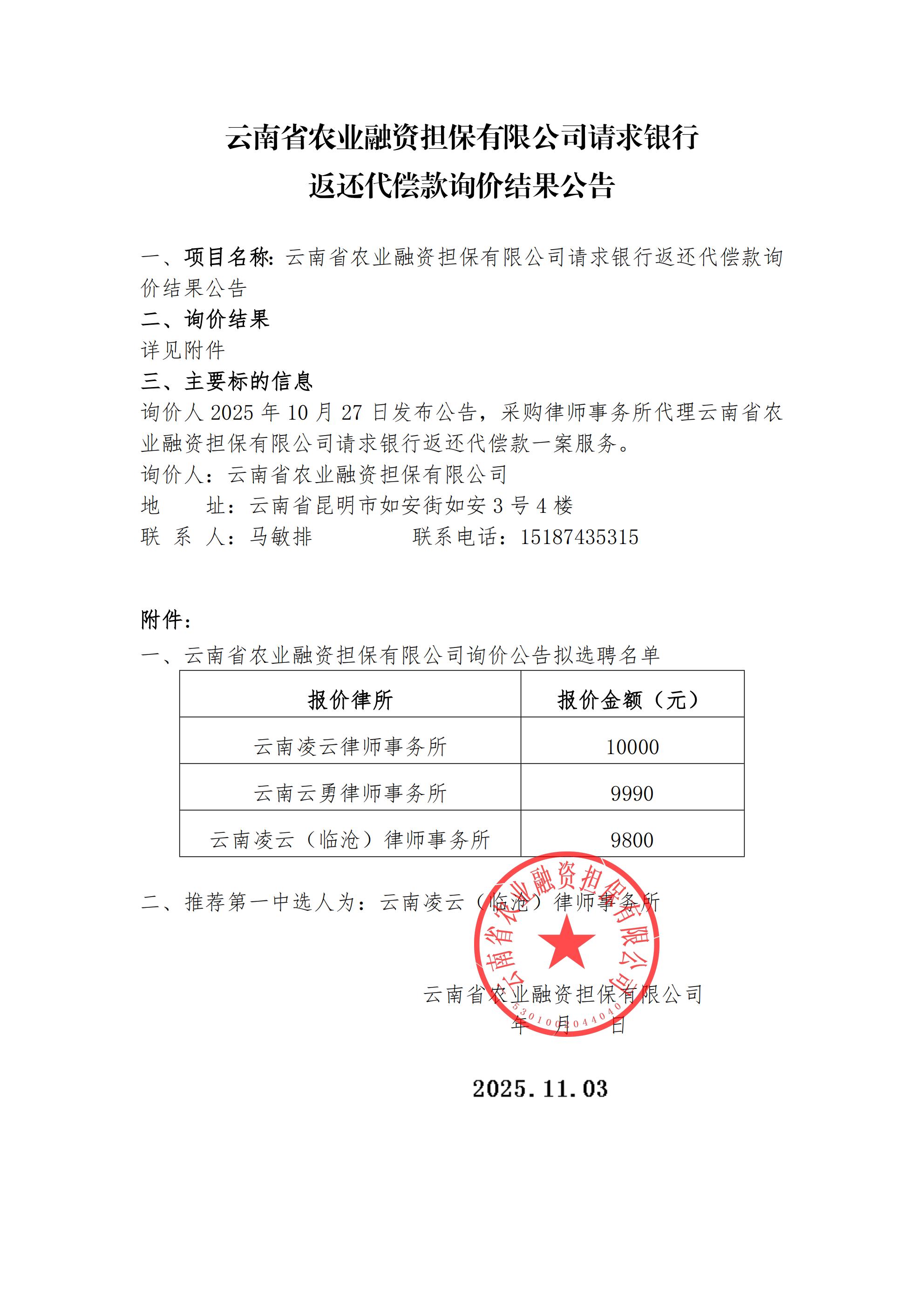 云南省農(nóng)業(yè)融資擔(dān)保有限公司請求銀行返還代償款詢價(jià)結(jié)果公告