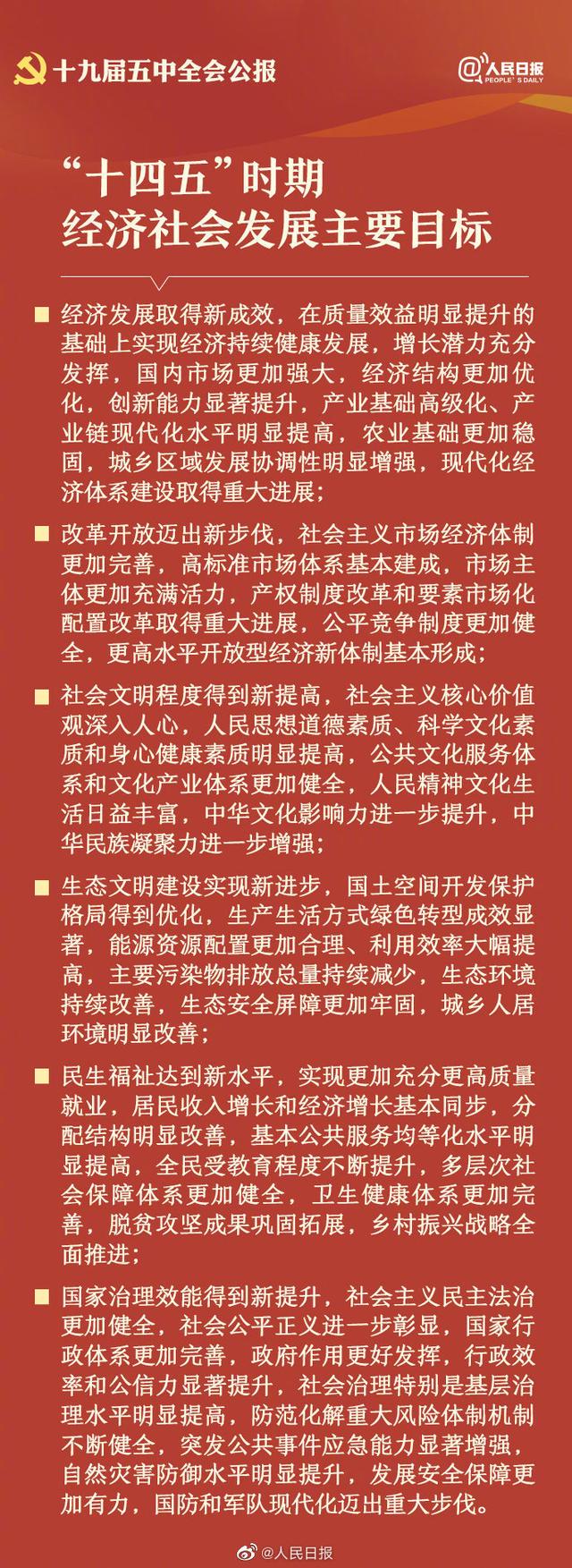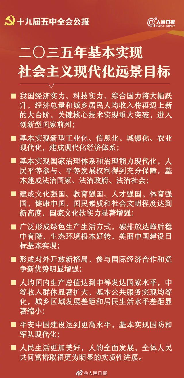 10月29日,中國(guó)共產(chǎn)黨第十九屆中央委員會(huì)第五次全體會(huì)議公報(bào)發(fā)布。全會(huì)高度評(píng)價(jià)決勝全面建成小康社會(huì)取得的決定性成就,提出了到二〇三五年基本實(shí)現(xiàn)社會(huì)主義現(xiàn)代化遠(yuǎn)景目標(biāo)以及“十四五”時(shí)期經(jīng)濟(jì)社會(huì)發(fā)展主要目標(biāo)。中國(guó)將如何實(shí)現(xiàn)這一宏偉藍(lán)圖,14個(gè)關(guān)鍵詞速讀五中全會(huì)公報(bào)。