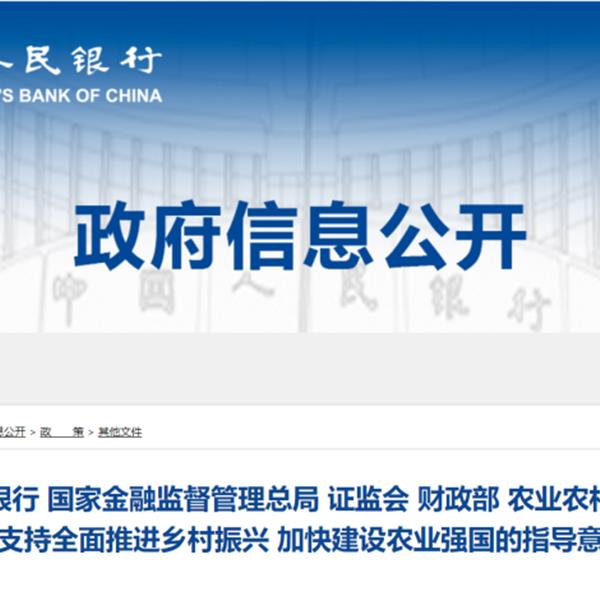 中國人民銀行、金融監(jiān)管總局、中國證監(jiān)會、財政部、農(nóng)業(yè)農(nóng)村部近日聯(lián)合發(fā)布《關于金融支持全面推進鄉(xiāng)村振興 加快建設農(nóng)業(yè)強國的指導意見》。